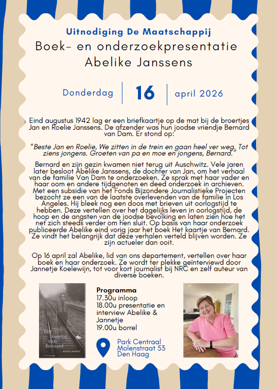 In aanloop naar de Nationale Dodenherdenking op 4 mei hebben wij uitgenodigd: Abelike Janssens en Jannetje Koelewijn, voor een onderzoekspresentatie over het boek “Het kaartje van Bernard”. Wij zien jullie graag op 16 april a.s. bij Park Centraal!