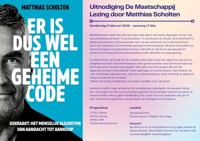 Met veel plezier nodigen wij jullie uit voor onze lezing op donderdag 5 februari a.s. met als spreker Matthias Scholten, die ons gaat meenemen in de geheime code van spreken.